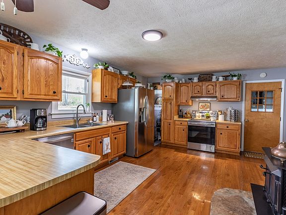 Spacious split-level home w/ lots of updates: all new windows, dual-zone HVAC, & fresh paint. Main floor has beautiful hardwood floors. Roomy LR w/ brick FP (gas) & lots of windows. Full-size DR has French doors leading onto back deck. Big kitchen w/ island, wood-burning stove, S/S apps & dbl sink, & access to back deck and garage. All BRs/BAs are upstairs. Primary suite has new carpet, walk-in closet, half closet w/ shelves, & step-in shower. Renovated full hall BA. 2 other BRs have balcony access w/ seasonal mtn views. Plenty of outdoor space including a rocking chair front porch, balcony deck, back deck (Trex) w/ hot tub, back patio (pavers), & fire pit. Level lot with room for gardening. Lots of perennials, 26 dogwood trees, a magnolia tree, & more dot this beautiful corner lot! Huge parking area plus carport & 2-car garage. Sewer/water for RV parking but deeded no mobile homes.