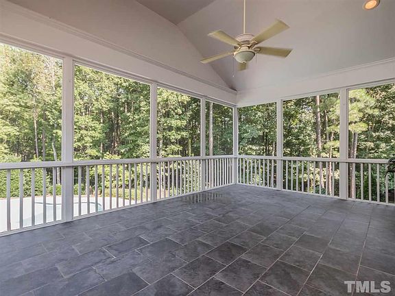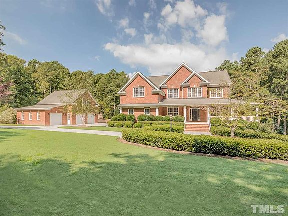 Inviting yet spacious estate nestled on 6.2 private acres. Relax on your wrap around front porch & welcome guests as they arrive around your circular drive. This ALL BRICK residence includes abundant space on 4 finished flrs. 4 BRs+3 additional flex rooms. 6.5 BAs. Fabulous daylight basement. Office loft w/kitchen and BA over garage. 5 garage bays + 3-car carport. Screened porch overlooking backyard oasis w/pool for entertaining. Convenient to 540, RTP, Jordan Lake, shopping, Am.Tobacco Trail & more.