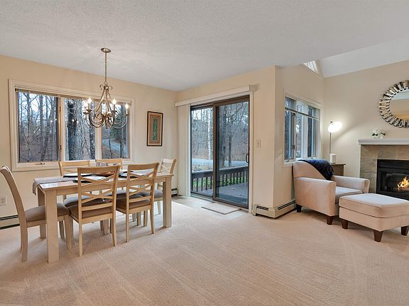 Spacious, fully furnished light filled end unit in the coveted Newton Village Association. This condominium has an open floor plan with cathedral ceiling, private deck and wood burning fireplace, well appointed kitchen with breakfast bar and a half bath with laundry. First floor primary bedroom suite with full bath and private patio. The second floor has a large bedroom, full bath, loft area and ample storage. Two parking spaces and onsite pool and tennis courts. Fantastic opportunity to own a QLLA property within walking/biking or golf cart distance to the Quechee Club, Lake Pinneo and all of the wonderful amenities.