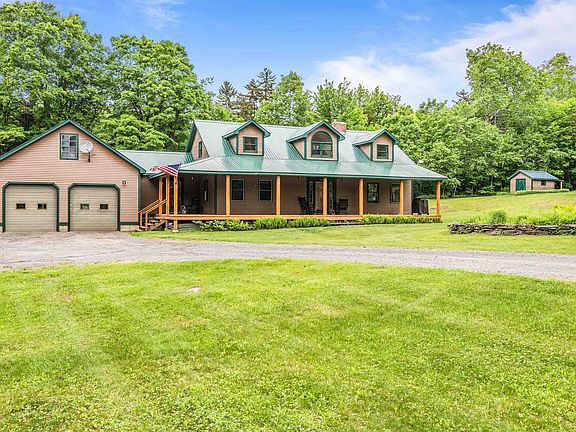 Nestled on 5 acres, this picturesque property offers privacy and seclusion, allowing you to immerse yourself in the beauty of nature and enjoy the quiet that surrounds you. This cape-style home is full of character, built from wood harvested and milled on-site and full of charming details like oak and spruce wood flooring, gorgeous exposed beams and 250-year-old doors, hardware and a fireplace mantle from Fort Ethan Allen. The sprawling front porch provides the perfect spot to relax and look out over the land and inside, the two-story foyer welcomes you with a view of almost every room on the main level! The dining room flows into the stunning kitchen equipped with beautiful wood cabinets, newer quartz countertops and stainless steel appliances. Off the kitchen is space for a breakfast nook as well as the mudroom with laundry and access to the two-car garage. The vaulted living room is spacious yet cozy, with wood beams above and lots of natural light coming in from the many windows. The primary bedroom with access to the shared ¾ bathroom and a separate office complete the first floor. Upstairs are two sizeable bedrooms with plenty of storage, along with a full bathroom and loft space. Outside, you’ll enjoy the shed, a sugar house and a wood shed as well as plenty of space to garden, add a fire pit or whatever else your heart desires! Close to Norwich and the Shaw Outdoor Center for great mountain biking and trails as well as just a few minutes to I-89 for easy commuting!