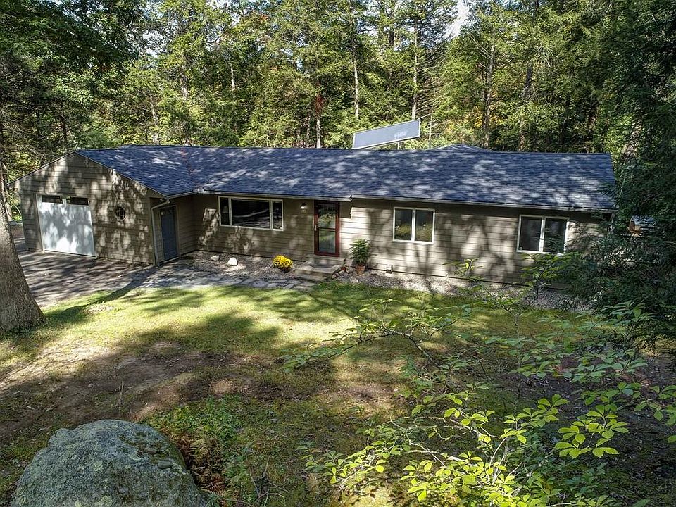 This home is situated on a quiet meandering road and located gently off the road canopied with trees. Enjoy this spacious single floor home with hard wood floors throughout. There is easy wheelchair access into the house from the garage. The eat in kitchen is quite large with a lovely island to watch the cook and overlooking a wooded natural habitat. Also, a separate dining room is located off the kitchen and living room. It is open and quite livable. There are three bedrooms at the end of the hall. The master bedroom suite is quite large with a deck off of it, and large bath and a shower suitable for a wheelchair. There are two other bedrooms and bath. Also, nearby is the laundry room with 1/2 bath. The new owner will get a new furnace, a new roof and new septic system. A Bird Watchers and nature enthusiast's paradise with a running brook. There is solar hot water with electric backup. If ramp removed one could have a 2 car garage. Circular driveway.