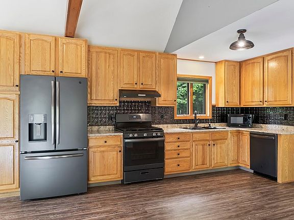 MANCHESTER - PRIVATE LOCATION! Chalet house with open concept kitchen, dining and living room. Many options with furniture. Cathedral ceilings. Kitchen with quartz countertops and updated appliances. Large deck with hot tub included. Whole house generator. New heat pump for cooling and heat. Several out buildings with over 10 acres of land with a mix of open space and wooded. Close to snowmobile and walking trails. 10 minutes to the turnpike.