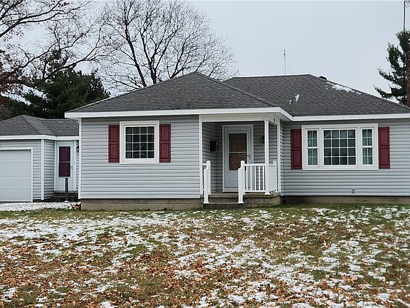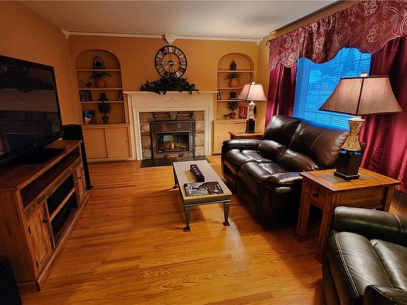 Light and bright ranch with gleaming hardwood floors, updated kitchen, remodeled bath, 2 spacious bedrooms, great storage and a partially finished basement! Convenient, easy one floor living! Kitchen has maple cabinets with pull out shelves, lazy susan, appliance garage, gas stove, refrigerator, microwave and breakfast bar that opens to formal dining area. All appliances including washer & dryer will remain. This home lives large! Living room has built in bookcases and a cozy electric fireplace. Three season breezeway with cermanic tile floor and french door to patio. Additional updates include wood panel doors, thermopane windows, vinyl siding, glass block windows, updated electric panel and generator transfer hookup. Basement finished area ideal for office space.