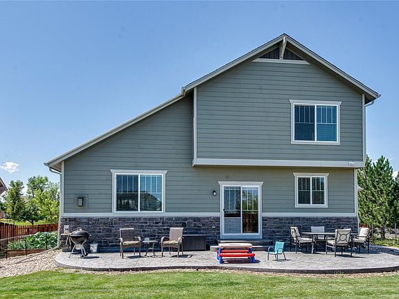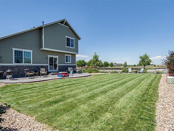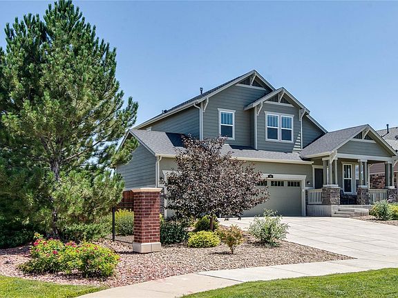 This stunning home certainly shows pride of ownership! Immaculately maintained! Set on a unique corner lot with one of the most private backyards in Adonea. Featuring an open floor plan with 4 spacious bedrooms, 3 baths, a great room w/vaulted ceiling & gas fireplace, & kitchen/dining area. Main floor bedroom can be used as an office. Kitchen has granite counters, stainless steel appliances & large patio off kitchen. Very big, fenced-in backyard w/partial rod iron fencing & gorgeous landscaping. Lovely wood floors in kitchen & dining area, & newer carpet throughout rest of home. Unfinished basement would be easy to finish & is pre-plumbed. Home is west-facing & has abundance of natural light. Plenty of storage in home, including large 3-car garage w/additional storage. Laundry room is on upstairs bedroom level. Home sits directly across from community pool/clubhouse & playground. Close to schools, parks, trails, shopping/dining. Quick access to I-70, E-470, DIA, fast commute to Denver!