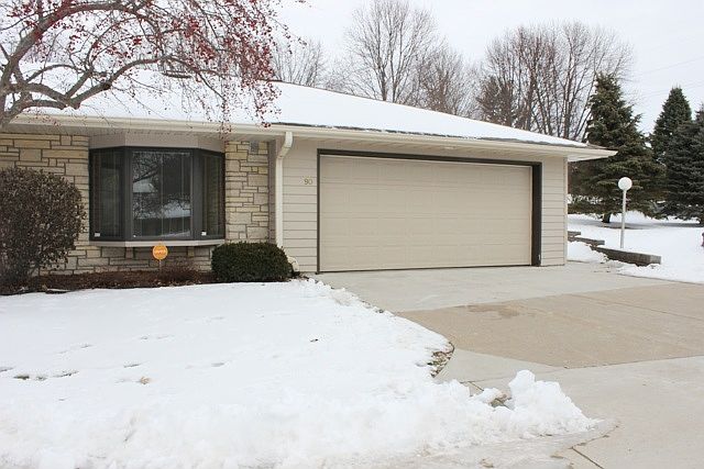 One level condo living at its best! Zero entry from entrance leads through entryway to large living area with french doors to three seasons room. Formal dining room could be used as nice office. Eat-in kitchen with hardwood floors. Large master bedroom and bath with walk-in shower, and tile floors. Second bedroom with great window & full main bath. Laundry closet in hall. Zero entry from 2 car garage with lots of built in cabinets. All appliances stay. Very nice and well maintained home on cul-de-sac.