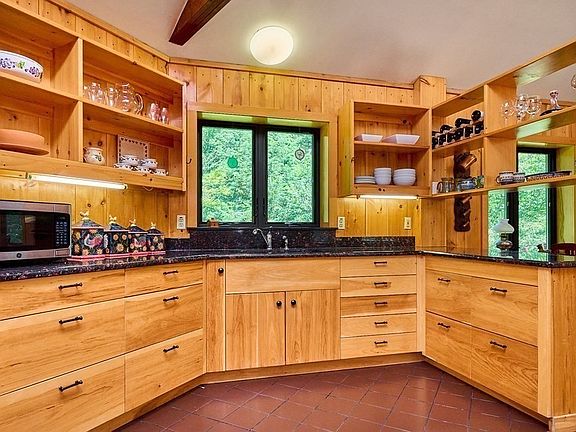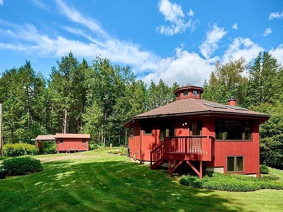 Inspiring and Unique, octagonal home, nestled amongst the trees on 5.73 acres, complete with a babbling brook, open green space, walking trails and stonewall gardens. Step inside this welcoming home and be prepared to fall in love. The home was custom designed with dramatic high ceilings, beautifully finished wood floors and an open layout that combines dining, living, kitchen spaces surrounded by casement windows, sliders and pine walls. Granite countertops complement the custom cabinetry giving the kitchen an open and airy feeling while skylights add more sunshine. There are 2 bedrooms and two full baths with sliders in the primary bedroom opening to the private back yard. Amenities include new mini-split for heat and ac, new stove, refrigerator, microwave, washer and dryer, 2 decks, a storage shed, high speed fiber internet and beautiful gardens. Easy access to Chesterfield Gorge, approximately 30 minutes from Pittsfield and/or Northampton. Truly a one- of- a- kind sanctuary.