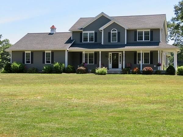 QUALITY BUILT Colonial Style home with an Inviting Wrap Around Porch. Comfortable and Elegant interior floor plan accented with crown moulding, wainscoting, French doors and oak flooring. Kitchen has Maple cabinets, granite counters, center island and stainless steel appliances. Stylish Dining Area nook looking out to the peaceful backyard. Spacious Living Room with a cozy gas fireplace. The Sunroom is a wonderful relaxing getaway with access to the Trex deck. There is a Half Bath w/ laundry hookups off the hallway area from the garage. There are 2 good size bedrooms & a double vanity Main Bathroom upstairs and a large Master Bedroom upstairs too. The Master Bedroom has 2 separate walk-in closets! A trayed ceiling and recessed lights. The spacious Master Bath has a double vanity sink, walk-in tile surround shower and linen closet.The two car garage has a small workshop area. A nice level 1.5 acre. yard, Holyoke Gas, convenient location and a move in ready home makes this a great home!