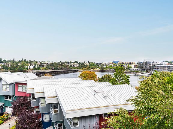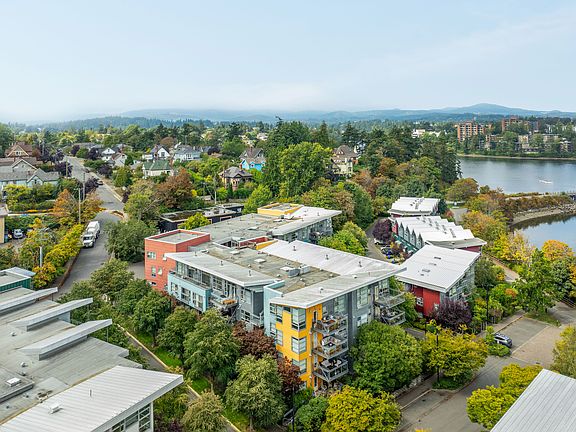 Discover the vibrant Railyards community, where urban convenience meets outdoor adventure. This top-floor unit offers stunning sunset views of the Gorge Waterway, Selkirk Trestle, and Mt. Tolmie, all visible through floor-to-ceiling windows that fill the space with natural light. Updates include a new kitchen with high-end appliances, engineered hardwood floors, custom shelving and blinds. The open-concept living area with vaulted ceilings is perfect for entertaining or birdwatching by the fireplace. Condo features a large bedroom, including in-suite laundry, secure parking, bike storage, and storage unit. Pets are welcome! Step outside to the Galloping Goose Trail, ideal for biking or walking into downtown, or exploring other trails. Head to the Railyards dock to catch a water taxi, or launch your kayak/paddle board, with rentable storage in the building. Enjoy easy access to the new Banfield Park dock, coffee shops, bakeries, groceries, restaurants, playgrounds, car share, and more!