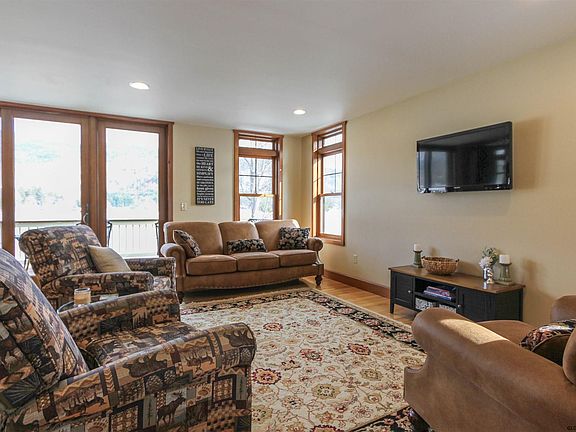 LAKE GEORGE LAKEFRONT. This turn key 2 Bedroom home has lake views from most every room in the house. Totaling over 1600sf, each bedroom has a private full bathroom, the living room opens up to the kitchen with a breakfast bar and a lakefront balcony. A half bath and laundry area are also on the main level. The lower level has a full bathroom, utility room and an open area with wet bar and living space that opens to a covered lakeside patio. Eastern exposure with beautiful views of Warner Bay and Pilot Knob mountain. From the patio you can walk out to your own sundeck covered U shaped dock on Lake George. The dock can hold 3 boats. Off street parking. Lake George Schools.