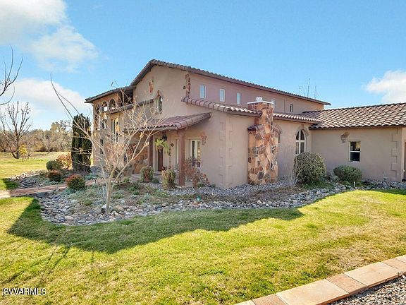 Old World meets Tuscan Villa (and Vineyard)!! Creek front location built with unique green construction features such as ICF walls, insulated slab, tile roof, solar panels, heat pump hot water, and Geothermal HVAC system. Inside boasts Travertine floors in main rooms and baths, with walnut on stairs and loft level. Tongue and groove pine ceilings in master bedroom, living room and kitchen. In addition, kitchen has copper sinks, cherry cabinets, lovely butcher block island, IGA gas stove and range hood, and Sub-Zero refrigerator. All the luxury features you desire. Upstairs has a breathtaking Ramada complete with 180 degree views of the mountains and Oak Creek with a hot tub to soak it in... Spacious back patio w/pony wall seating around built in fireplace and pizza oven. More....