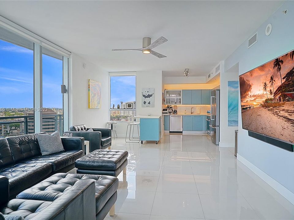 Ivy Condo Downtown Corner unit with amazing City and river views! Impeccable condition! Two bedroom- Two bathroom with tile and laminate in bedrooms. New Kitchen-aid kitchen appliances. Microwave can also become oven. New Samsung side by side washer and dryer. New ceiling fans in LR and MBed, Spotlight fixtures, Motorized shades and smart home lights throughout, floating deck tiles on balcony. Bidet toilet in Master bath. Furniture Negotiable including TV’s (85” Sony X900F in LR, 65” Sony X900F in MBed) Gym, Pool, Spa, Hot tub. Amenities deck was recently remodeled. Dog park next to river was recently remodeled. Phase 2 will be Lobby, Elevator Foyers, Hallways and Party Room renovations. Walking distance to Brickell and Downtown shopping, restaurants, and nightlife. This will not last!