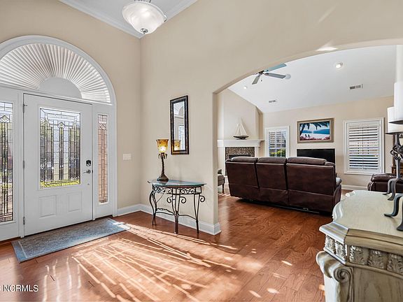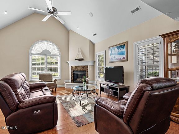 Prepared to be impressed! This former model home was designed with quality and convenience in mind. Enjoy one-level living throughout the entire home. Spacious rooms filled with lots of natural light, chef's kitchen complete with a view of the dining room and breakfast/sitting room. You will never miss out on conversations while entertaining. A fireplace in the living room offers the opportunity for cozy nights with a glass of wine. The dining room and the owner's primary bedroom offer beautiful tray ceilings with enhanced lighting. Spacious Owner Suite offers multiple closets, plenty of room, and a nice soaking tub in the bathroom. The large garage offers a utility sink and lots of space for storage. This popular community offers amenities such as a clubhouse, pickleball, pool, basketball area and more! Only a short drive to the beaches and great food or shopping! Don't miss this one!