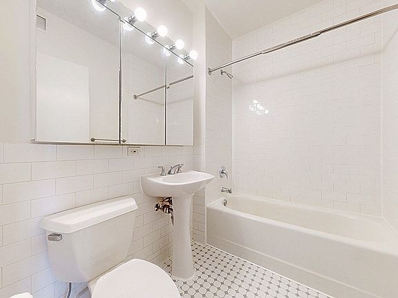 Modern Bathrooms with decorative tile, hexagonal floors, and illuminated vanity mirrors