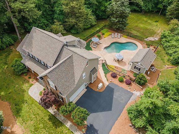 Welcome to this Meticulous Custom Home in a Serene Setting with a Private Pool! Located on nearly 3.5 acres, this beautiful property offers hardwood floors and extensive crown molding and tons of natural lighting. Cooking is a delight in the kitchen, that features high-end stainless appliances including a Bosch refrigerator and dishwasher and Bertazzoni gas range, Quartz counters, bar seating, Merillat Classic custom cabinets with crown, recessed lights, and a bright breakfast area. The family room has a marble-surround gas fireplace and includes two sets of French doors that open onto the deck. Enjoy meals in the formal dining room that features a double column entry and is wrapped with wainscoting. There's also a bright sunroom with a cathedral ceiling and three walls of floor to ceiling windows to admire the outside landscape. A living room, two-story foyer, and powder room complete the main floor. Custom window shutters throughout. Journey up the winding staircase to the owner's suite that includes two walk-in closets, a unique light fixture with inset fan, and a spa bath with two vanities, a jetted tub, and a separate shower. The second floor also offers three nice size secondary bedrooms with large closets, a full bath, and laundry room with upper cabinets and a utility sink. The finished third floor bonus/bedroom suite is very spacious and includes a full bath and a door to access the unfinished walk-in attic. Step outside to the backyard oasis that includes a fenced in private pool, pool house with kitchenette and half bath, and a Trex deck with gazebo. And you may spot a few deer grazing in the backyard. Other details include a new roof in 2021 and a whole home generator. Set in a peaceful wooded surrounding offering privacy yet just minutes to downtown Pittsboro, Chapel Hill, Jordan Lake, and easy access to US-64 and US-15/501!