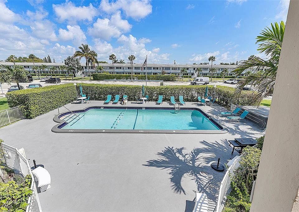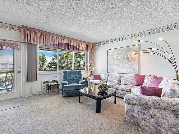 This furnished 1-bedroom unit on the top floor offers a tranquil pool view and boasts all impact windows and a front door conveniently located near the elevator. Situated east of US1, it's close to the beach, casino, restaurants, and more. While it's a coop, there's no land lease and no assessment. This 55-plus community features amenities like a pool and shuffleboard.