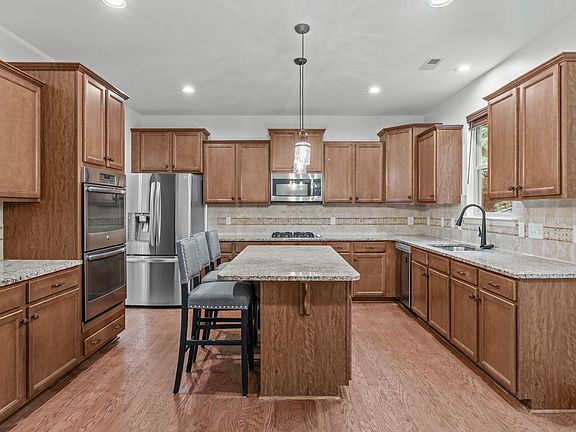 Welcome to 900 Bay Bouquet Lane, a spacious and versatile home in sought-after Ellington Place offering plenty of space, a smart layout, and a prime Apex setting. The main floor is designed for both everyday living and entertaining. A full bedroom and bathroom on the first level make the perfect guest suite or home office, while the family room with a cozy gas fireplace flows seamlessly into the gourmet kitchen. Here you'll find granite countertops, a gas cooktop, double ovens, abundant cabinet space, and a large center island. A formal dining room, engineered hardwoods, and thoughtful upgrades complete the main level. Upstairs, the expansive owner's suite is a true retreat, featuring a tray ceiling, spa-style bath with jetted tub and walk-in shower, dual vanities, and two generously sized walk-in closets. Three additional bedrooms and a spacious bonus room with a closet, ideal as a 5th bedroom, playroom, or media room offer flexibility for every lifestyle. A third-floor unfinished walk-up, already plumbed for a bathroom, provides even more potential for future expansion. Outdoor living shines with a private fenced yard backing to protected woods. Enjoy morning coffee or evening gatherings on the large deck and patio, with no homes directly across the street adding to your sense of seclusion. Additional highlights include a laundry room with utility sink, a brand-new hot water tank, ample storage throughout, and a two-car garage. Located less than a mile from Apex Community Park and just minutes to Costco, shopping, dining, and top-rated schools, this home offers the perfect balance of convenience and privacy in a highly desirable Apex location!