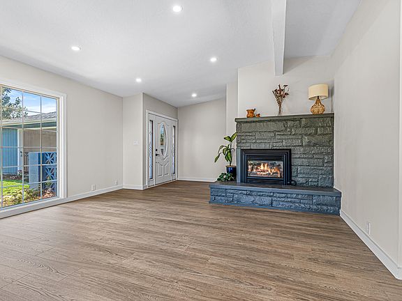Welcome to this completely updated, one of kind, ranch style home in desirable East Medford. This 3bd, 2bth home sits on a large .37 ac lot w/ views overlooking the valley & nearby mountains. As you step inside this bright & cherry modern home, you capture the views out from the floor to ceiling windows in the spacious living room. Cozy up to the  fireplace in the winter months. New hardy waterproof laminate flooring throughout. Kitchen features Quartz counters, new cabinetry & stainless appliances. The extra wide hall leads back to the bedrooms w/ primary bdrm situated at back of the home. The newly renovated primary bath features a double vanity & walk-in tile shower. There is a large dining area w/ slider out to back patio. Also back exit through utility room. Fresh paint inside and out. New roof in 2024. Lots of parking including a two stall carport with extra storage. Fenced back yard features a large patio with terraced gardens, private, retreat like feel w/views of the valley.