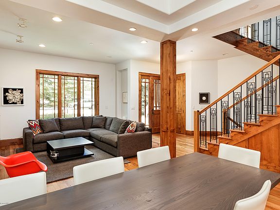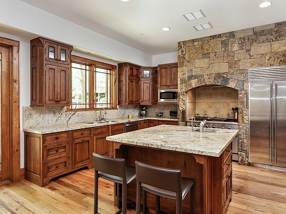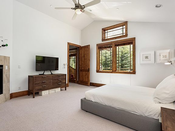 Located in Aspen's Cemetery Lane neighborhood, this spacious three-level mountain-style home offers an easy living layout and a tranquil backyard space with plenty of room and a unique shared pond. The large upper-level master suite has a fireplace, steam shower, private deck space and exceptional privacy, while the three bedrooms on the lower-level are near the media room for games and other diversions. The main-level with impressive great room, large kitchen with eating area and island, wet bar, and circular patio are warm and inviting for entertaining indoors and out.