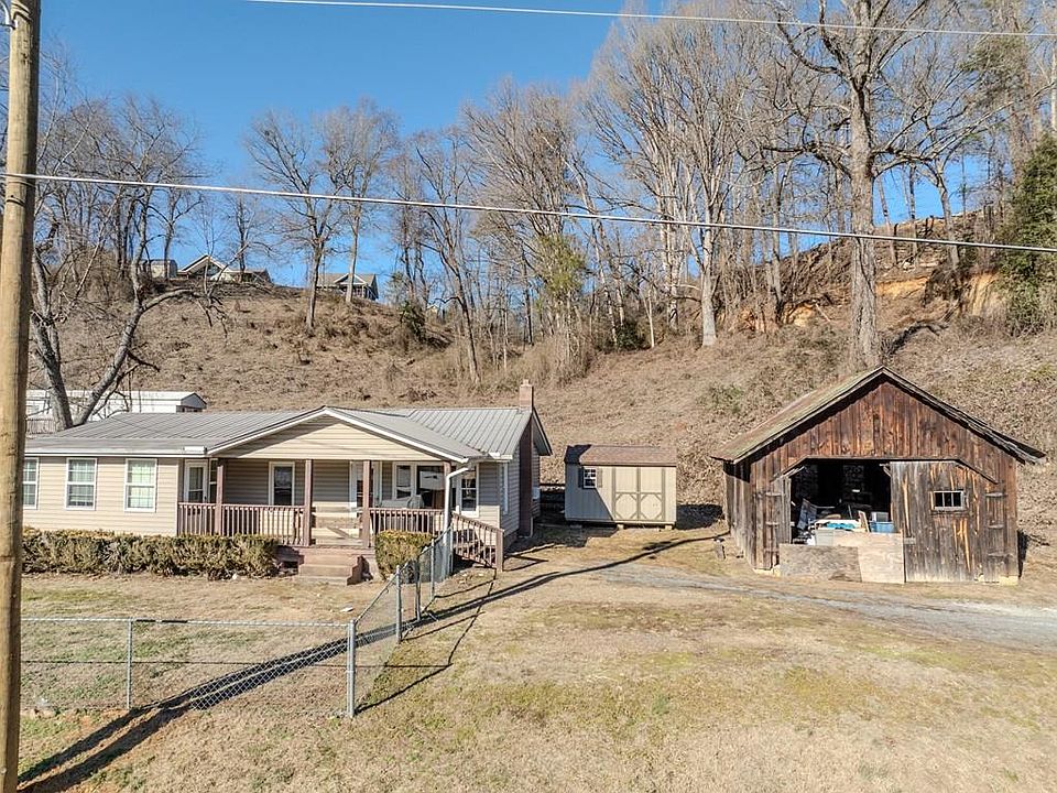 Charming home located within Bryson City limits, sitting on over 2 acres! The primary bedroom offers a spacious bathroom and a sunroom for added relaxation. There's also a dedicated office/study area. A generously sized room, currently being used as an additional bedroom, is conveniently located off the living room (please note, this room does not have a window). The expansive living room features beautiful wormy chestnut wood and a centrally located wood stove for warmth and ambiance. The kitchen and dining area are designed in a practical galley style. A storage room can be accessed from the back of the house, and a large laundry room adds to the home's practicality. The front yard is fully fenced. A large barn/shed provides ample storage space, along with a smaller storage building. For further details, please refer to agent comments.