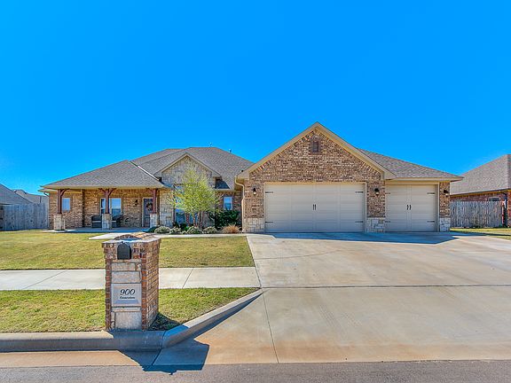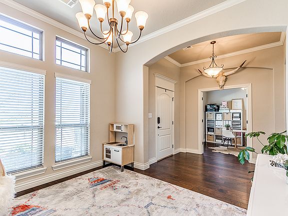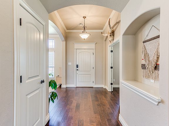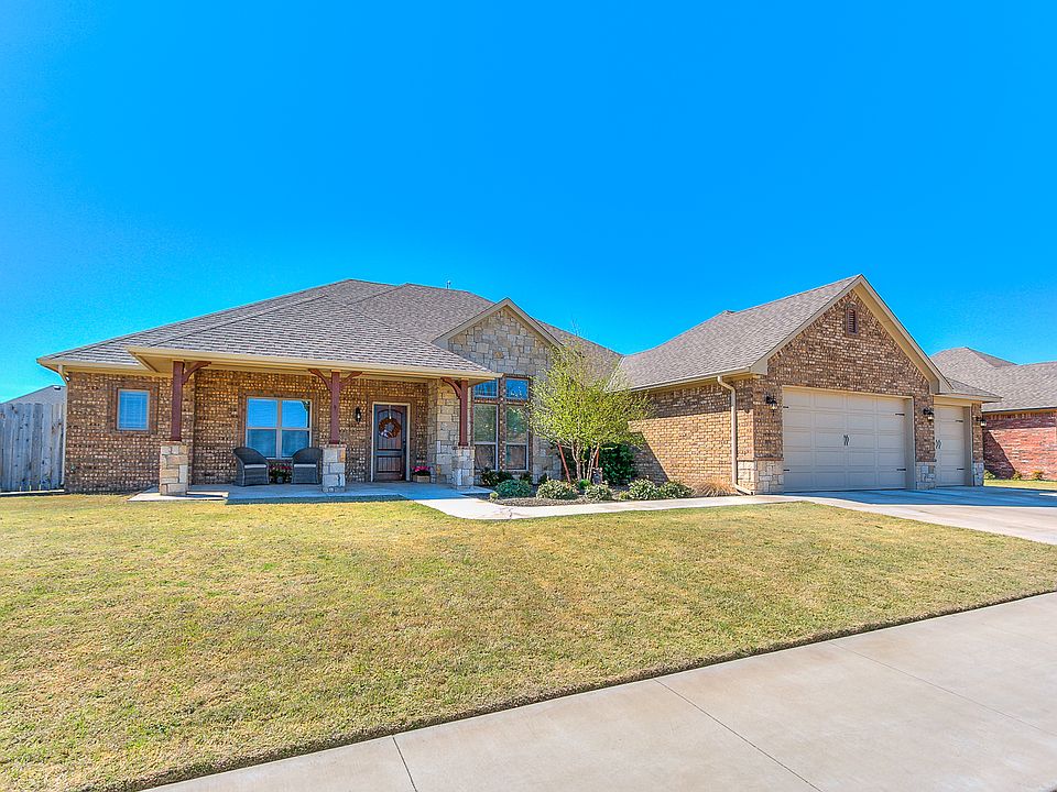 This stunning 4 bedroom 2 bath home is a show stopper! You'll love the designated office with french doors and formal dining room with shiplap feature wall. There's a great open flow from the living room to kitchen & informal dining then out to the covered patio. The living room has 10 ft tray ceilings with crown molding & a gas log fireplace.The kitchen has knotty Alder cabinets, granite countertops, a large eating bar, center island & a pantry WITH Stainless appliances & a new dual oven. Beautiful upgraded light fixtures throughout. The peaceful master bedroom suite has a new sliding barn door that opens to the master bath retreat. It features a jetted tub and separate shower, dual sink vanity and walk in closet. Three other bedrooms share a full bath on the West side of the house. The 3 car garage has over 950 sq ft & a STORM SHELTER. Sprinkler system front & back.