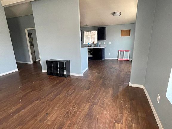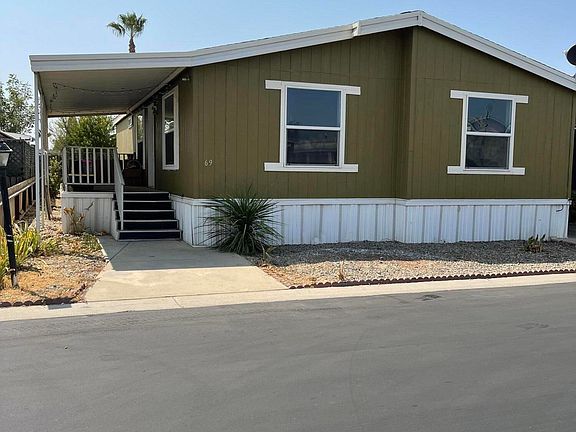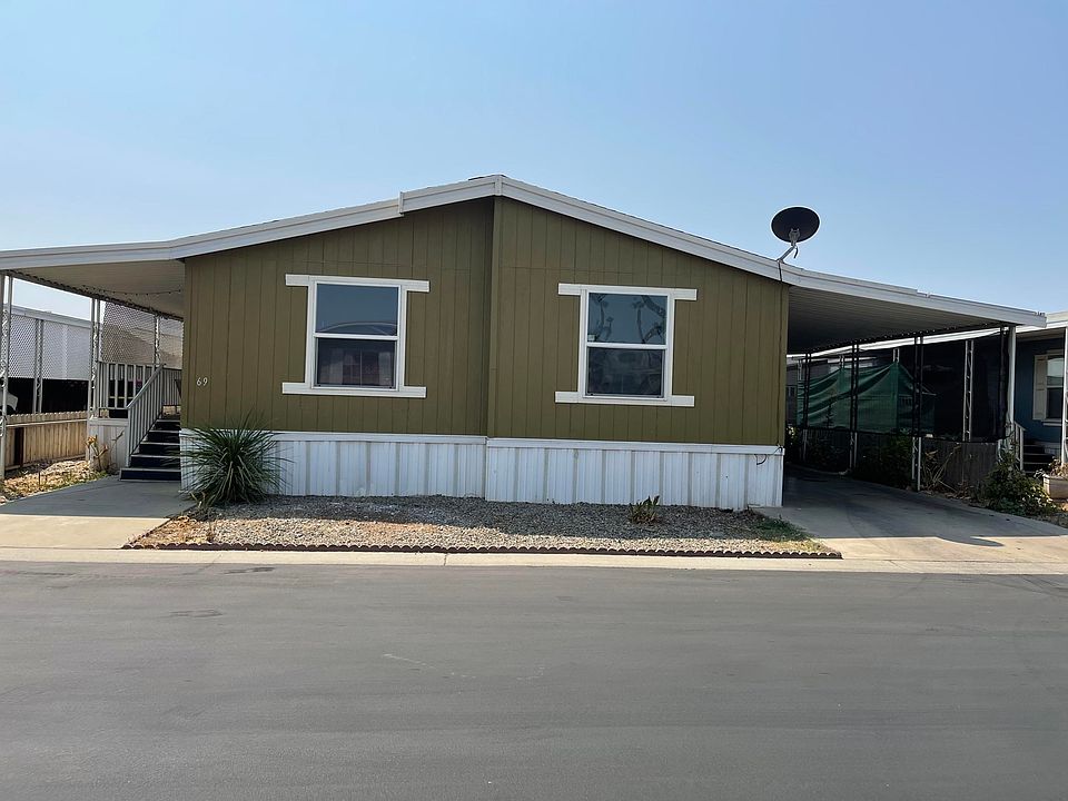 This freshly painted manufactured home hosts 3 spacious bedrooms and 2 baths. Master bedroom has his and hers closets, Master bath includes a large storage closet and nice large bathtub. The spacious living room can be seen from the dining area and the dining area is open to kitchen. Off the kitchen is the washer dryer hookups. This space has fruit trees and a shed in the back. The Mobile Home Park has a pool, basketball court, a playground as well as a clubhouse.