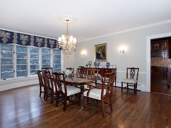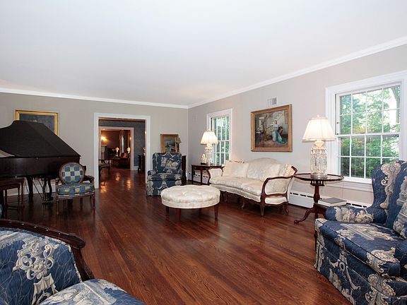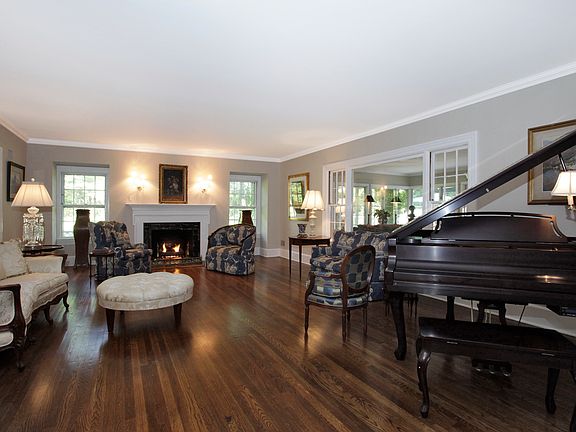 Tranquility and serenity await you at this stunning 14-room Colonial nestled on almost two-and-a-half acres of private property. The lush grounds include magnificent gardens with sculpted hedges, mature trees and specimen plantings, and a graceful, free form in-ground pool with soothing waterfall. Set at the end of a quiet cul-de-sac, the house is not visible from the street offering the seclusion you desire; yet the neighborhood provides easy access to major thoroughfares and public transportation.You'll get a glimpse of the home's grandeur from the circular driveway accented by a koi pond. Once inside, you'll appreciate the fine attention to detail from top to bottom. Built in 1954 and renovated to perfection, the spacious rooms offer gleaming hardwood floors, crown and decorative moldings, arched doorways, and six-panel interior doors. The elegant formal living room with its gas fireplace offers a set of French doors that lead to the large Family Room, surrounded by windows that bring the beauty of the outside in. A second fireplace is found in the handsome library, which also features built-in bookcases. A floor-to-ceiling bow window in the formal dining room looks out on the magical backyard. The eat-in gourmet kitchen boasts custom cherry cabinetry, including a bi-level peninsula with a breakfast bar for two, granite countertops, and sleek, stainless steel appliances. A fully appointed Butler's pantry provides additional storage and counter space. The bright and sunny breakfast area provides access to the slate patio and pool area, ideal for warm weather entertaining. Two generous-sized bedrooms, each with a walk-in closet and full bathroom, are also located on the main level.Upstairs, the incredible Master Suite includes an expansive bedroom with gas fireplace, oversized dressing room, charming sitting room, and a large home office (or potential sixth bedroom) with walk-in closet and bath. Two additional bedrooms, each with a full bath and walk-in closet, and one with a cozy sitting room, as well as a home gym with en-suite laundry room complete this level. The fully finished lower level includes a recreation room, an enormous workshop, a relaxing sauna, a wine cellar, access to the attached two-car garage, and plenty of storage space.