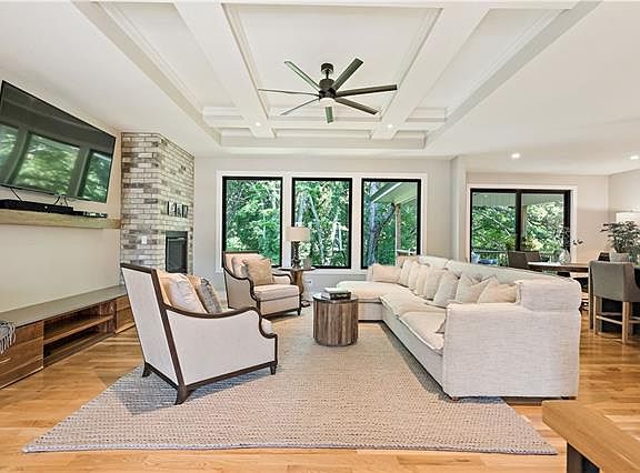 Mid-century modern influenced architecture and interior design makes this A STUNNING, one of a kind, 3 bed/ 2 bath, one year old ranch home. The property sits in a quiet cul-de-sac, close to Kearney Schools and backs to lush green space. The interior is warm and welcoming, yet exudes a modern and sophisticated aesthetic with it's design and finishes. The open main level floor plan showcases a beautiful modern living room/ kitchen/ dining area with access to a picturesque covered deck surrounded by trees, perfect for morning coffee and bird watching. The main level also features a luxurious master ensuite, two large bedrooms with a full bath between them and main level laundry. The full unfinished basement is a blank canvas full of possibilities to make the space your own and walks out to a tree lined patio. This property is breathtaking. You will not want to miss the chance to call it HOME.