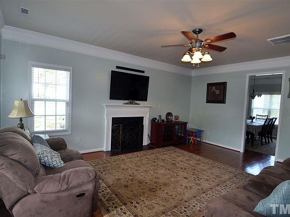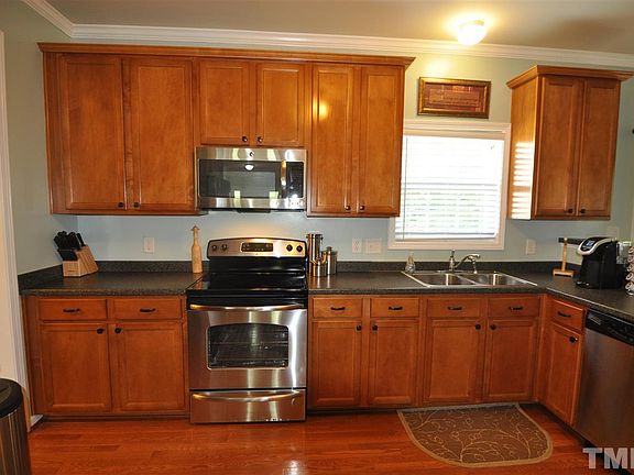 Beautiful 2 story home on large wooded corner lot w/ great floor plan. HW floors throughout 1st level. Crown molding throughout. Gourmet Kit w/ 42" cabs, SS double sink w/disposal, SS kitchen appliances included. Upgraded fixtures and ceiling fans throughout. Large master suite, walk-in closet, garden tub & separate shower. Unfin. third floor w/ rough plumbing & dedicated extra circuit. Deck leads to fenced lot, your very own apple tree and short walk to community park. Located in the heart of Knightdale.