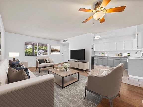 Welcome to this move-in ready 2-bedroom, 2-bath home in the established 55+ Kern City community. Beautiful wood flooring flows into the living room, creating a warm and inviting space. The glass door and windows fill the dining room with natural light and offer views of the lush greenery off the backyard covered patio. The kitchen features white sleek quartz countertops, ample storage, and stylish two-tone cabinetry. Both bedrooms offer brand-new carpeting for a fresh, cozy feel. The dedicated laundry room includes built-in shelving for added storage and organization. Outside, a generously covered patio is surrounded by citrus trees and peaceful greenery the perfect place to relax and enjoy the outdoors.