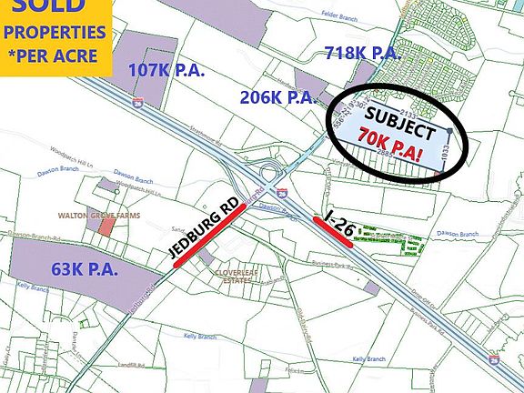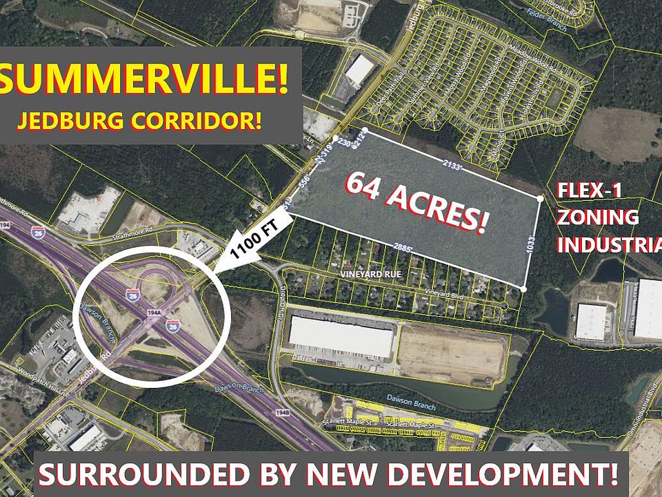 ****ATTENTION!! -- 64+/- ACRES! -- JEDBURG RD & I-26 CORRIDOR! **** OVER 1000 FT FRONTAGE!! -- PRICED BELOW ALL THE RECENT SURROUNDING PROPERTY SALES!!! (SEE PICTURES!!) -- THIS AREA IS EXPLODING WITH NEW DEVELOPMENT, AND THIS IS ONE OF THE LAST LARGE TRACTS AVAILABLE!! -- CURRENTLY ZONED FLEX-1 (BERKELEY COUNTY) *** CLOSE PROXIMITY TO: Shopping, restaurants, Cane Bay, New Roper Hospital, Carnes Crossroads, Nexton, Volvo, and 30 min. from Downtown Charleston! - **SURVEY AND WETLANDS STUDY available in DOCUMENTS! ***WATER & SEWER AVA! (FORCED MAIN WATER located directly across street & FORCED MAIN SEWER located immediately Adjacent NE property!) *(Home on property will be moved, prior to closing).****PLEASE NOTE! -PAY SPECIAL ATTENTION to the WETLANDS STUDY (Full WD Ava upon Req. - too Large to fit in MLS) attached to the MLS. According to the WD, the property consists of approx 30+Acres of wetlands, most all of which are to the back and backsides of property. Buyer can mitigate as they deem fit, with approval by governing authorities. **Seller says the county will NOT allow Residential development, they want Industrial/commercial - ALL the information we have been able to obtain from the sellers, and any/all third-party organizations, including but not limited to city/county and other entities, has been posted to this MLS (under "Documents"). If you do not see the item in question, it is because we do NOT have them. -- Unless specifically noted, these items in question, will be the buyer's responsibility, either during the DD period or post-closing. Thank you.