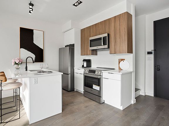 Welcome to 900 Knickerbocker Avenue, a new, boutique condominium development featuring 6 beautifully designed apartments. Nestled within the vibrant neighborhood of Bushwick, this newly constructed condo building exudes sophistication with its beautiful brick facade and contemporary amenities. Choose from a selection of high-ceiling upscale residences basking with natural sunlight that floods the space courtesy of the corner unit design. Each unit is equipped with Bosch appliances, washer and dryer hookups, and elegant 5” oak wood flooring throughout. The lavish bathrooms feature deep tubs and floor heating, while spot lighting, and a split unit system for heating and cooling has been meticulously curated to enhance your living experience. Residence 3A is a triplex apartment with a private rooftop, featuring 2 bedrooms, 1 full bath and a half bath, approx. 976 S.F. with south and east exposures – it additionally includes a 28 S.F balcony and a 386 S.F rooftop terrace. Enjoy the convenience of being just one block away from the Wilson Ave subway station, providing swift access to Union Square in a mere 18 minutes. Bushwick is a diverse and vibrant neighborhood known for its artistic community, trendy cafes, street art, and lively nightlife scene. Don't miss your chance to discover the epitome of upscale living —schedule a viewing at 900 Knickerbocker today.