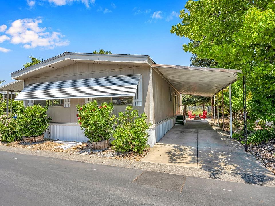 This lovely home has a great location - on the edge of the park so no neighbors behind, close to clubhouse and pool, public transportation and downtown Calistoga. New flooring throughout, updated bathrooms and kitchen. Floorplan has a great flow between all the living areas. Primary bedroom has a sunroom, front porch at entry and plenty of room in the back for a deck or anything else your heart desires!