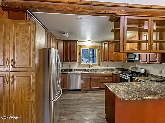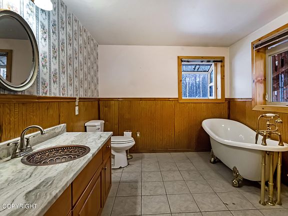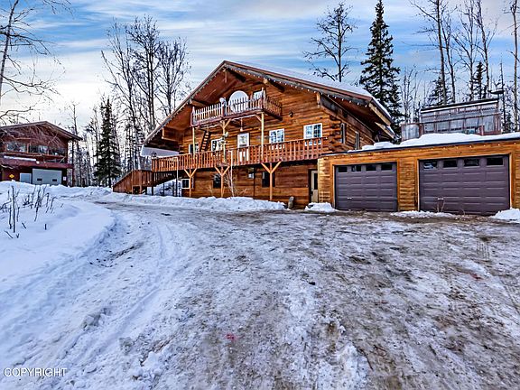 Experience Alaskan charm in this 2 bedroom 2 bathroom log home with an attached 2 car garage and a detached shop on 2.12 acres. Nestled amidst nature, enjoy tranquility & privacy. Enjoy the master bedroom and tiled bathroom with clawfoot tub & shower on ground floor. Cozy up by the fireplace or unwind on the wrap around porch. Detached shop offers ample storage/workspace with the loft/bonus area.