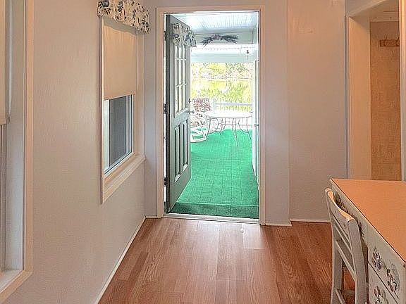 Step into a spacious, sunlit living area open to the dining room and kitchen. Sliding glass doors lead to the front porch, while tinted windows offer privacy and natural light. Beautiful inlaid flooring flows throughout, complemented by window blinds – perfect for cozy movie nights or lively gatherings with friends.