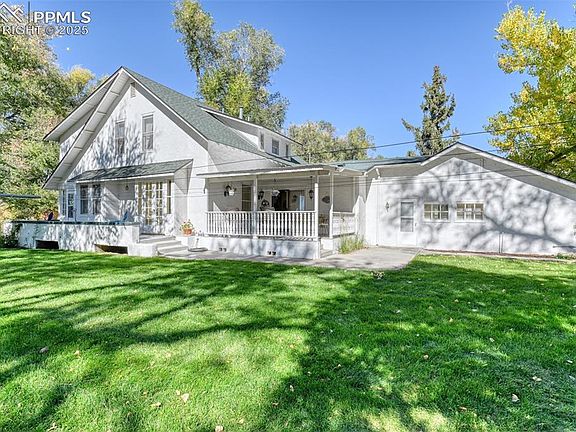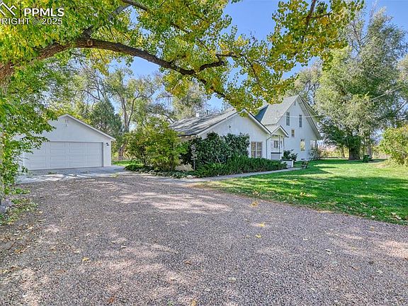 seller incentives! Ask about assumable loan . Nestled on over 21 picturesque acres, this captivating estate features a freshly remodeled white farmhouse, 3 spring-fed ponds, and sweeping views of the Front Range and Pikes Peak. Fully renovated with fresh paint, new carpet, tile, and many other upgrades. The nearly 4,000-square-foot home includes 4 bedrooms, 3.5 baths, and a new oversized 2-car garage. The primary suite spans the western wing, offering unobstructed mountain views. The spacious eat-in kitchen has custom cabinetry and opens to a large covered deck overlooking two of the ponds, a favorite spot for local wildlife. Original hardwood floors, wainscoting, and atrium doors add timeless elegance to the formal dining room. The expansive living room features a wood-burning fireplace with marble surround and flows seamlessly into a west-facing garden room, where vintage farmhouse windows frame stunning natural scenery. A highlight of the home is the 500 sf recreation room—ideal for a pool table and shuffleboard—with a nearby ¾ bath and large walk-in shower. The basement offers a spacious room with laundry chute, washer, dryer, freezer, and 3 additional rooms. A fenced 'play yard'—complete with concrete shelters—can house chickens and peacocks. Stretching 100 feet, a row of barns includes a tack room, several workshops, a 900 sf garage and an adjacent 20' x 30' office. The property runs on a private well while connected to city sewer, and the largest pond irrigates the landscaped yard and pastures—ideal for agricultural use. There are four pastures, fully fenced. Mature trees throughout the grounds have been professionally trimmed. Additional recent improvements include new roofs on all structures, fresh sod, a new sprinkler system, updated hot water heater, furnace, and electrical panel. Be sure to check out the drone video!