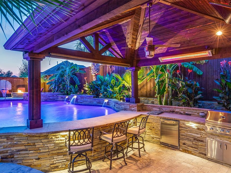 - Exterior features: Gas Grill, Lighting, Outdoor Grill, Outdoor Kitchen, Outdoor Living Area, Private Yard, Rain Gutters