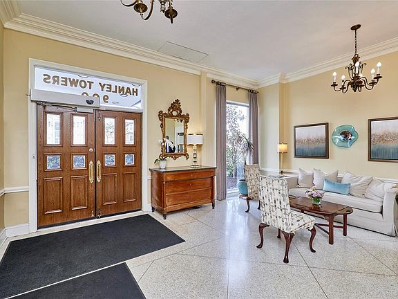 Welcome to Apartment 7A at Hanley Towers, a stunning high-rise condo offering 1,963 sq. ft. of luxurious living space. This beautifully updated unit features parquet flooring and fresh white walls, complemented by sleek light fixtures throughout. There are three spacious bedrooms and two full bathrooms. The primary bedroom offers everything you need, including a walk-in closet with shelving and a bathroom complete with a modern white vanity, marble countertops, and a spacious shower.