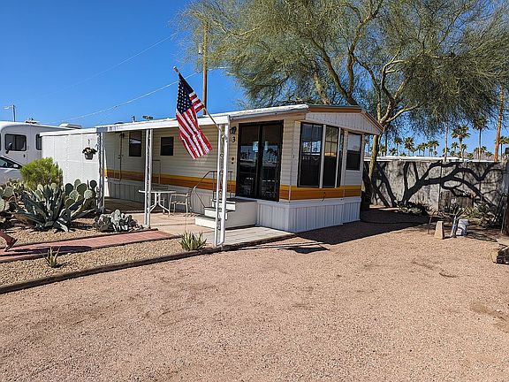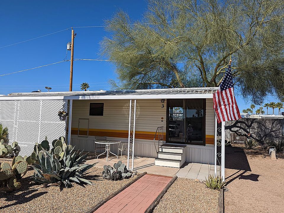 Cute 1 bedroom, 1 bath home in 55+ park, 2 off street parking spots. Dishwasher, new water heater, hook-ups for stackable washer and dryer or full size hookup outside on patio, sleeper sofa,Carrier heat pump and AC, roof was just resealed, shaded awning patio with table and 2 chairs. Couple blocks from downtown Apache Junction, Fry's, Walgreens, restaurants.