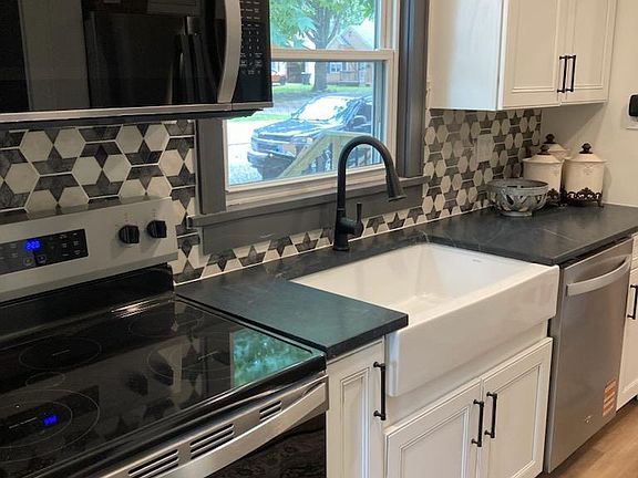 Adorable bungalow has been fully renovated to create a warm and cozy French country cottage home. Kitchen upgrades include new tall, soft-close cabinets, black soapstone granite countertops, farmhouse sink, decorative tile backsplash, and new stainless steel appliances. Bathroom has been upgraded with a marbleized porcelain tile shower surround, medicine cabinet, distressed wood vanity, accessible toilet and decorative floor tile. New paint, electrical upgrades, lighting fixtures and luxury vinly plank flooring has been added throughout. Special features include an electric fireplace in living room and a ship-lap accent wall in the primary bedroom. The exterior boasts a new front and side porch, lighting, trim paint and gorgeous flower beds, side enclosed porch, back patio and fenced in yard. This house is enchanting!
