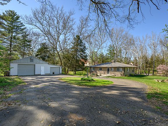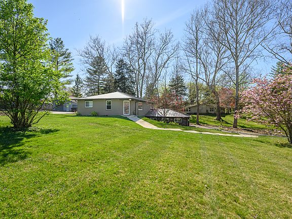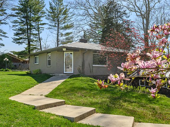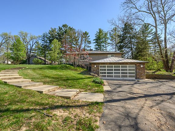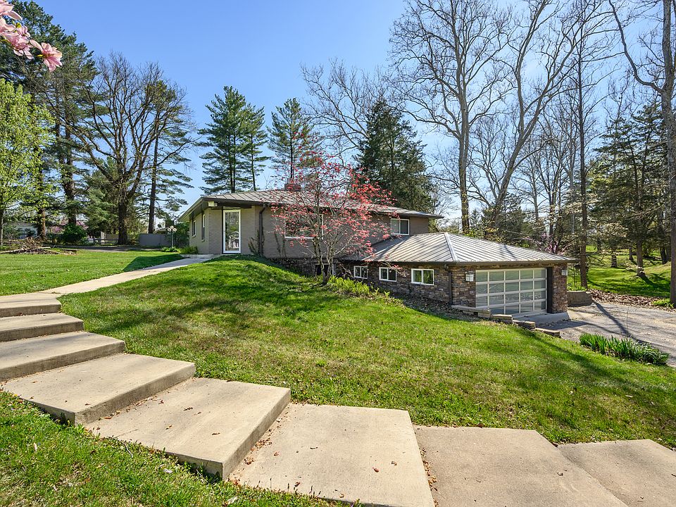 This tastefully decorated Mid-Century Modern brick home is situated on a lovely landscaped lot with mature trees in a highly sought-after area. The open floor plan features 3 bedrooms, including a full walk-out basement that is currently used for the Primary Suite/4th Bedroom. The living room is spacious with an abundance of natural light. Enjoy entertaining in the conveniently located kitchen and dining areas. The updated kitchen has stainless steel appliances, granite countertops, and plenty of storage space. Enjoy the convenience of the private driveway that leads to the 2-car attached garage. On the other side of the property is a separate 3-car heated garage/workshop situated on a circular driveway.