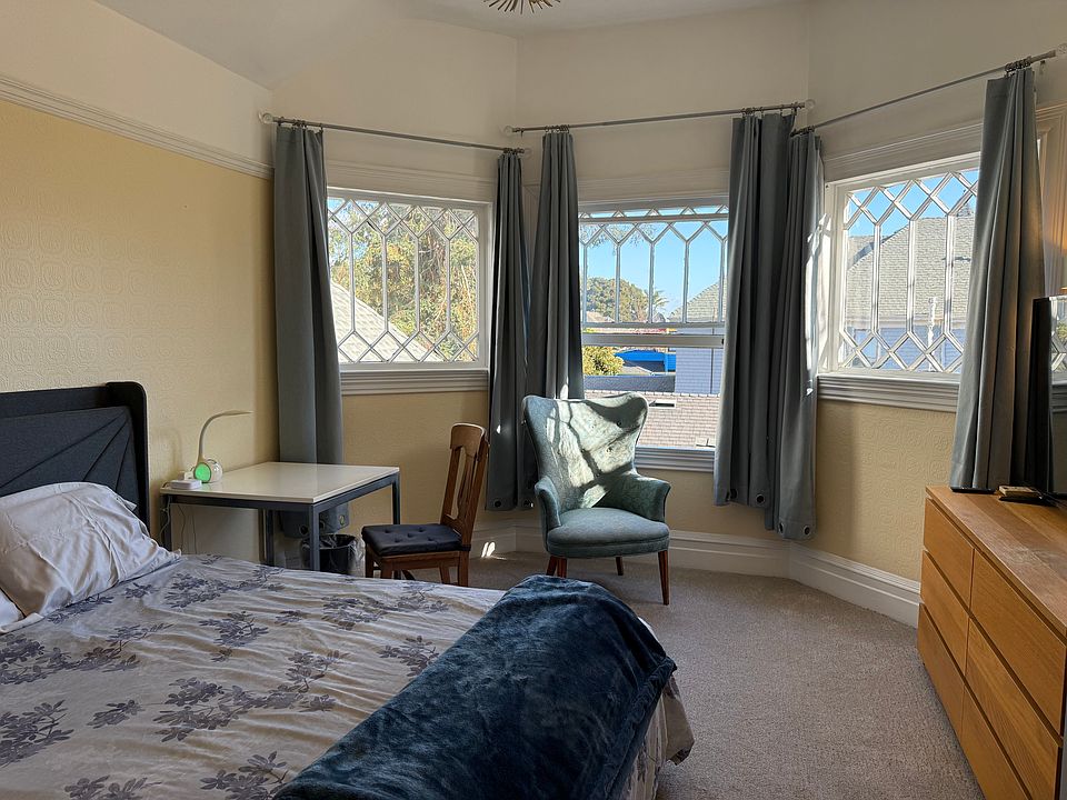 Hotel Living! Studio alternative. Hotel alternative. FURNISHED, beautiful, great area, move right in... Short or long term pleasant housing. Flexible. Fast 2Gigabit Internet, Large TV - ALL UTILITIES INCLUDED. Sunny space in historic building. European Style. Great neighborhood. Furnished rooms with TV, wireless internet. Very clean, pleasant place with nice responsible people. Private. Available: Sunny, spacious Second-floor room with Private Bath with Large, new shower. Refrigerator, Microwave, Coffee pot. Queen bed, Large TV, desk/table, reading chair, bookshelf - all furniture and linens. High ceilings, carpet, Large windows. Sunny. Shared full kitchen downstairs - fully stocked with pans, dishes, etc. Fast wireless internet (fiber 2Gigabit service) and large smart TV included. Linens provided. Sheets, towels, toilet paper, paper towels provided. Common areas and baths cleaned regularly. Pleasant, clean! Rental rooms use side entrance to large Victorian house. Huge, historic, well-kept. Great area for walks. Laundry in building. Easy parking. Walk to Park St. shops, South Shore Safeway and Trader Joe's, parks, bus stops, Beach. Easy access to OAK airport. Security deposit $750. Long or short term OK. Two month minimum. A very nice place. Flexible lease term - two month minimum. No smoking. No pets. We have pets on the property. Stay long or short term - flexible. FURNISHED - all utilities included. Fast internet - INCLUDED. TV and Linens - INCLUDED.