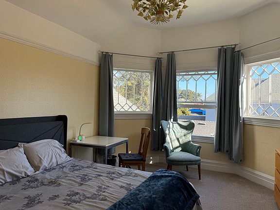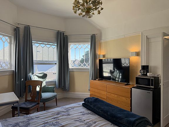 Furnished, beautiful, great area, move right in... Short or long term pleasant housing. All utilities included. Private locked unit. Huge, sunny efficiency room with Private bath. Spacious, sunny. Private Large walk-in shower. Fully Furnished - Desk, TV, Queen bed, Reading chair, dresser, lamps, linens. Refrigerator, microwave and coffee pot. Large windows, high ceilings, new paint, new large shower. Carpeted. Second floor with nice outlooks. Shared full kitchen also available - fully stocked with gas stove and oven, pans, dishes, etc. Fast wireless internet (fiber 2Gigabit service) and 55" smart TV included. Linens provided. Sheets, towels, toilet paper, paper towels provided. Common areas and baths cleaned regularly. Pleasant, clean! Sunny efficiencies and studios in historic building. European Style. Great neighborhood with beautiful Victorians, close to beach and shopping. Furnished with TV, fast wireless internet. Very clean, pleasant place with nice responsible people. Private. Separate space. No Smoking. Rentals use side entrance to large Alameda Victorian. Huge, historic, well-kept. Great area for walks. Laundry on site. Easy parking. Walk to Park St. shops, South Shore Safeway and Trader Joe's, parks, bus stops, Beach. Easy access to OAK airport. 2 month minimum. Available Feb 1 or sooner if needed. Short or Long term. Two-month minimum. Month-to-month with 30-day notice when you leave. Utilities included. Furnished- including one set linens. Toilet paper and paper towels included. Common areas and bathrooms cleaned bi-weekly. No smoking inside the building. Keep the shared kitchen clean and tidy. We have friendly pets - they do not enter your room or your hallway. Because our pets are here, we do not allow other pets.