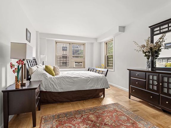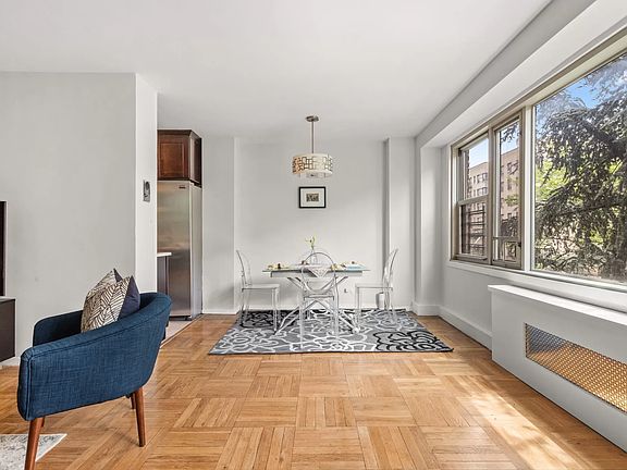 The apartment is east-facing over the garden and arguably the most beautiful blue spruce tree in Hudson Heights. Both the living room and bedrooms have wall-to-wall beds Graham windows, which have a UV protection coating. The primary bedroom has a unique corner window layout. The whole home has original, natural hardwood parquet floors, updated tile work in the kitchen, and an updated bathroom with a soaking tub.