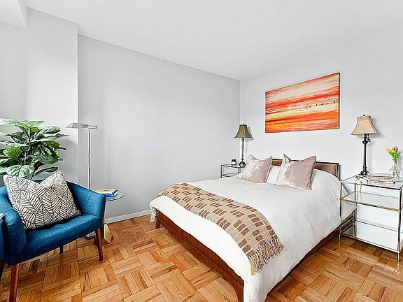 The studio's layout allows for a natural separation between the living and sleeping areas. Abundant natural light fills the sleeping nook, comfortably fitting a queen-sized bed. Additionally, the northern exposure of the apartment provides quiet and peaceful neighborhood views.