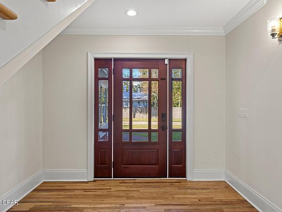 With profoundly tranquil views of St. Andrews Bay, this upgraded residence exudes Coastal New England charm. Complemented by a half-acre corner lot next to an alley, giving it more room and privacy than many of its neighbors, the home is adorned by a large screened patio that offers panoramic bay views. Inside provides a different perspective of the same waters being observed from nearly every room. Beautiful hardwood floors adorn all rooms, including the four bedrooms upstairs, additional flex space-loft, upstairs living room, the main living space downstairs, an office, and kitchen. Numerous built-ins provide ample storage areas located throughout the home.