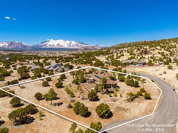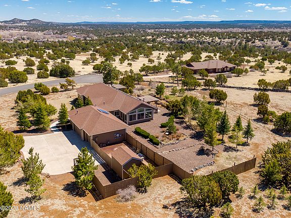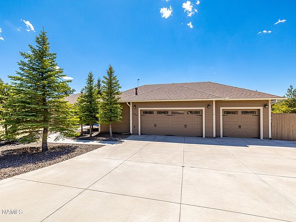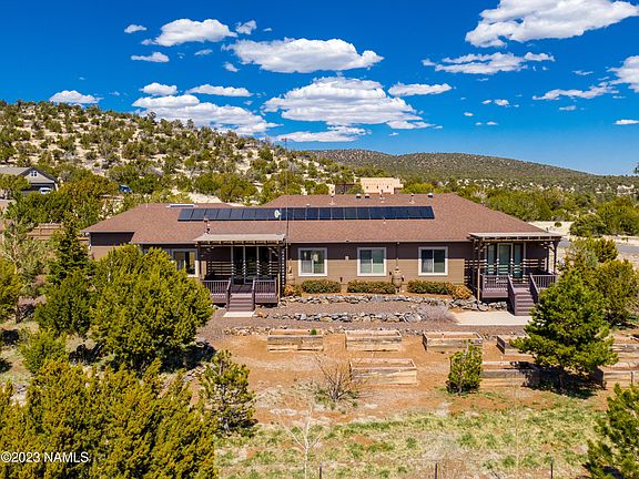 Amazing SINGLE level home backing FOREST SERVICE. This original owner home has been meticulously cared for. Arizona Room is the perfect place to enjoy the beauty of the San Francisco Peaks. Open floor plan with gas fireplace, vaulted ceilings, tiled floors and views galore. All you could want for in a kitchen knotty alder cabinets, pantry, double oven, stainless appliances and granite counter tops. The primary suite is spacious and has french doors leading to a private covered deck, the en-suite is complete with soaking tub, dual sink, granite counter and tiled shower. 3 additional bedrooms and bath. Awesome features of this home are as follows: CENTRAL AIR CONDITIONING, HYDRONIC IN FLOOR HEATING, l 3-car garage,SOLAR, LOW UTILITIES, shed, irrigation system and raised beds.