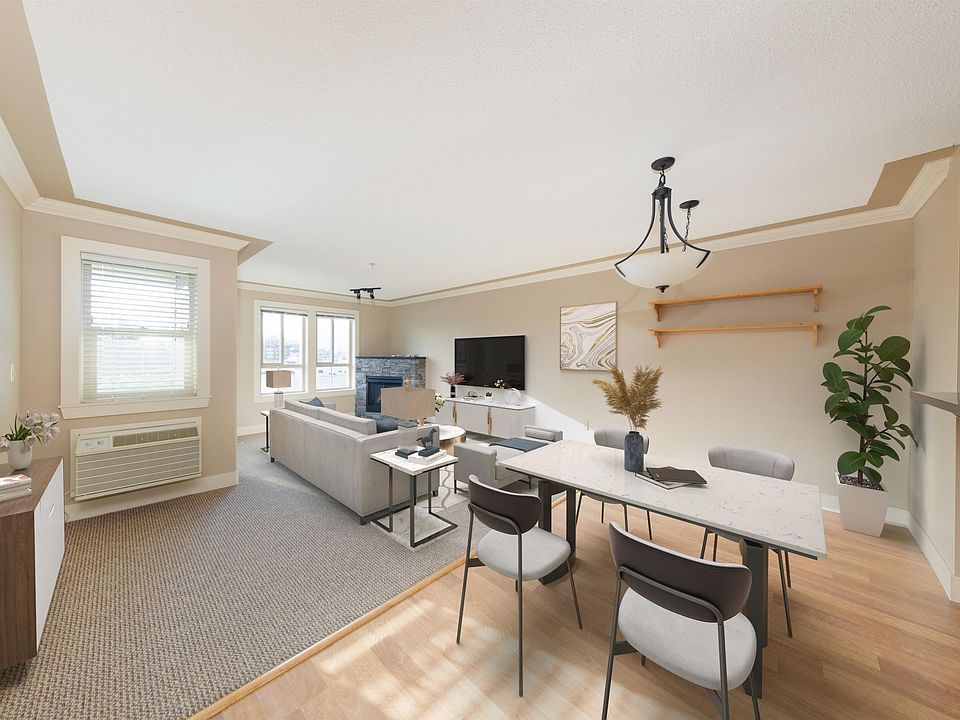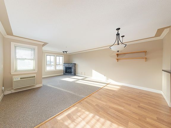 Vacant and move-in ready, this spacious 855 sq.ft. 1-bedroom condo offers both comfort and convenience. Located just steps from shopping, dining, banks, the library, Chilliwack General Hospital, and the leisure centre. Enjoy stunning 180-degree mountain views and sunsets from your private balcony. The unit features a cozy stone fireplace, built-in computer nook, granite countertops, tile flooring, and access to the balcony from both the living room and bedroom. Additional highlights include hot/cold AC, in-suite laundry and storage, newer semi-industrial carpets, and appliances (excluding the range) replaced from 2022 onward. The building offers secure underground parking, a clubhouse, a library, and is pet-friendly. BC Assessment Value: $366,000. A must-see!