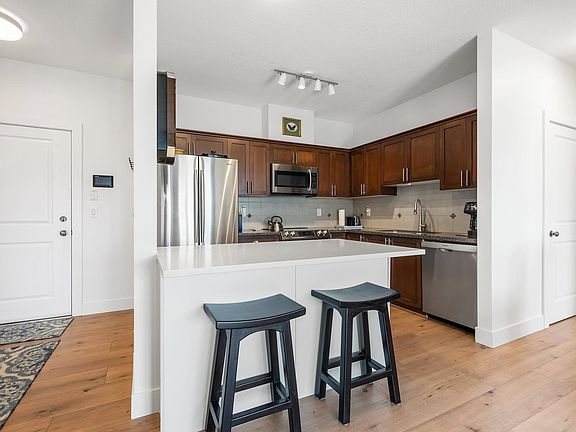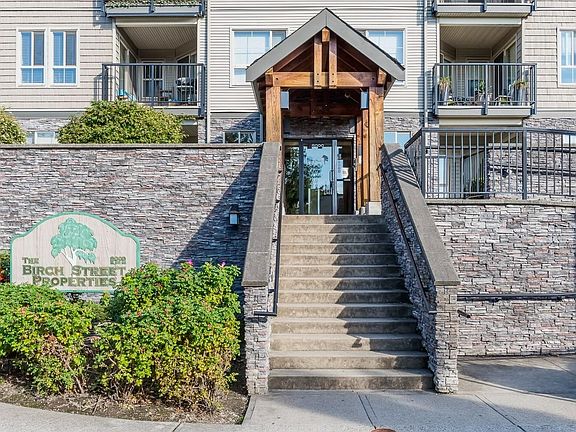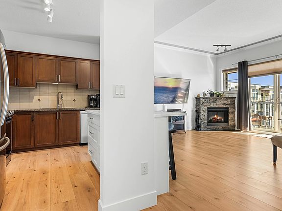 Welcome to this spacious bright & airy TOP FLOOR 2 bed 2 bath condo just under 1,000 sq ft! Enjoy the gorgeous mountain views, plus grocery, pet store, pubs, bakery, coffee & more directly at your doorstep. Amenities include A/C (heat pump), cozy f/p, freshly painted throughout, gorgeous wide plank flooring, high ceilings, updated s/s appliances, island w/seating, secured underground parking, pet friendly & transit close by. Well designed floorplan w/2 large bedrooms & new walk in shower in the primary ensuite plus storage/in-suite laundry. Take advantage of this amazing location & enjoy spending your down time @ District 1881 to indulge in boutique restaurants, wine bar, shopping, coffee & salon/services just a 10 min walk away making living at Birch St. an easy & carefree lifestyle.