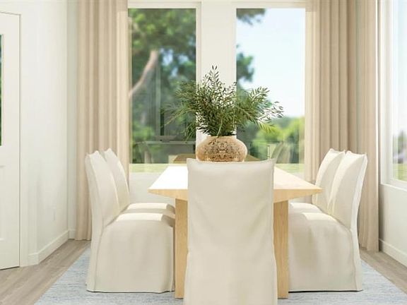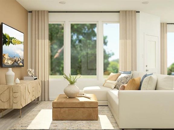 This single-story home shares an open layout between the kitchen, nook and family room for easy entertaining, along with access to the covered patio for year-round outdoor lounging. A luxe owner's suite is in a rear of the home and comes complete with an en-suite bathroom and walk-in closet. There are two secondary bedrooms at the front of the home, ideal for household members and overnight guests.