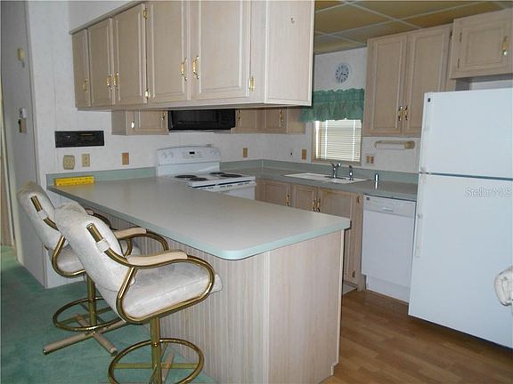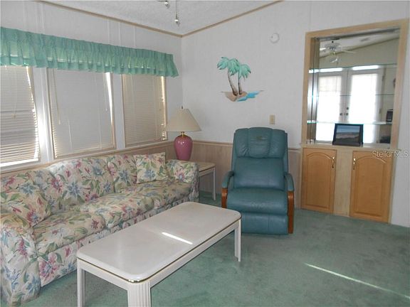 55+ This two bedroom/one bath, all one level home featues a spacious living room, a dining room with a built-in cabinet, and a galley kitchen with a breakfast bar and bar stools. The master bedroom has lots of storage and separate bath. The guest bedroom has nice storage and outside access. The driveway will accommodate two cars or a car and a golf cart. The front porch is great as you get a partial view of the golf course and Lake Daveport. Outdoor Resorts has many amenities for you to enjoy including a free par 3 golf course, 2 heated pools, tennis, horseshoes, pickle ball, shuffleboard, and a clubhouse with church, Bingo, and many holiday celebrations. The HOA fee of $530/quarter pays for your water/sewer/basic cable/trash/lawn mowing and park upkeep. And, don't forget...you own the land! This park is located about 4 miles to the entrance to Disney.
